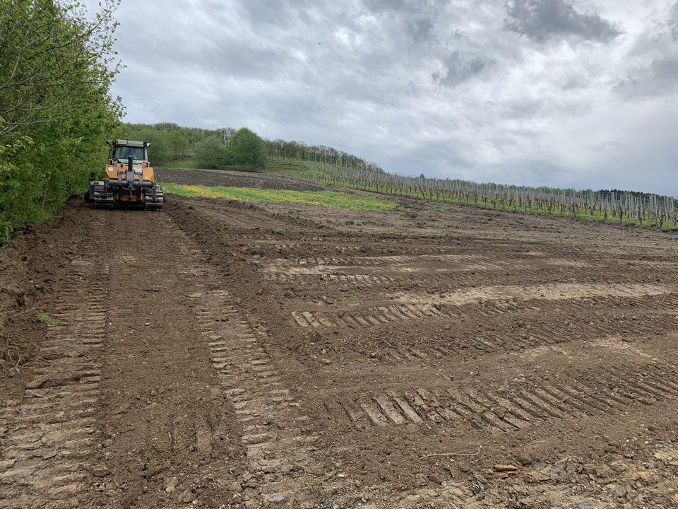 Anfang letzten Jahres haben wir eine Fläche von rund 5500 qm rekultiviert. Der zukünftige Weinberg war jedoch nicht zur modernen Bewirtschaftung geeignet, weil sie im unteren Bereich einen enormen Überschuss an Boden aufwieß und deshalb eine Einfahrt mit Traktor unmöglich machte.
