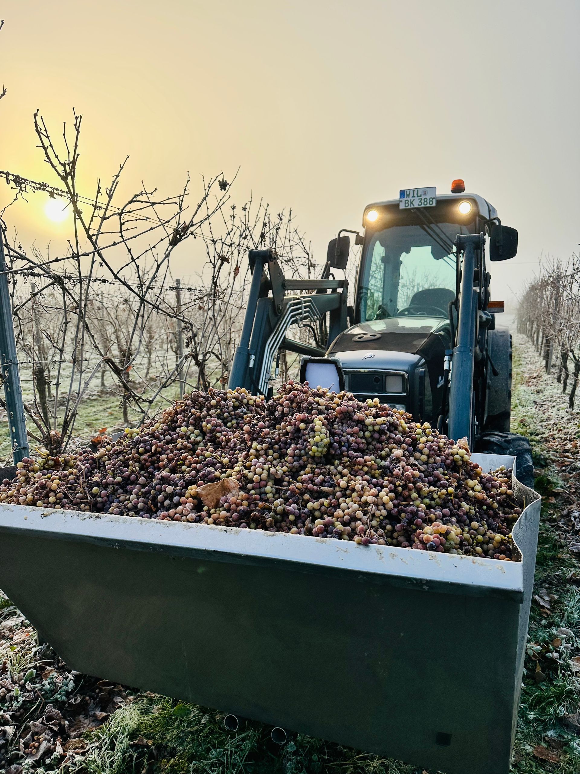 Den gestrigen Morgen, am 22.11.2025 werden wir so schnell nicht vergessen. Bei –9 °C konnten wir endlich wieder einen Riesling-Eiswein ernten – ein Ereignis, das selbst für erfahrene Winzer immer etwas Magisches hat. Eiswein gehört zu den seltensten Spezialitäten des Weinbaus, und besonders in zunehmend milderen Wintern fühlt es sich wie ein kleines Geschenk an, wenn es gelingt. Und dieses Jahr fiel die Lese sogar auf den Geburtstag meines Vaters.